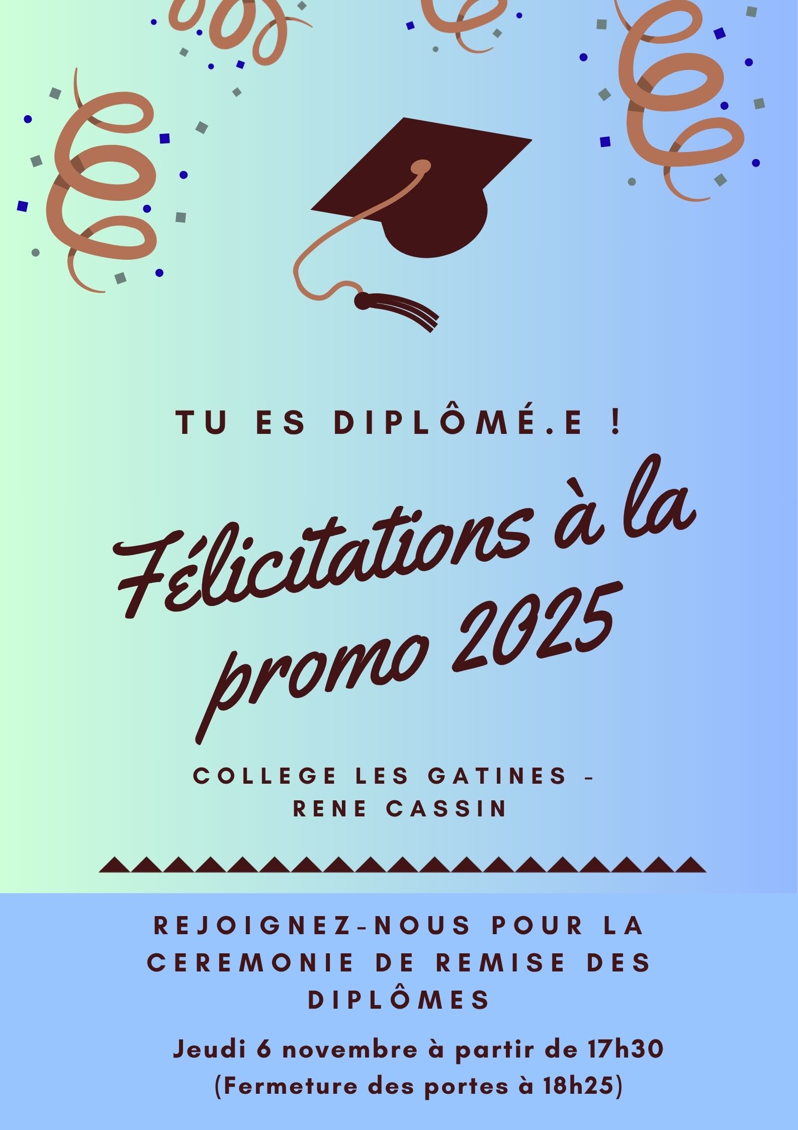 La cérémonie de remise des diplômes du DNB aura lieu le jeudi 6 novembre 2025 à partir de 17h30 -